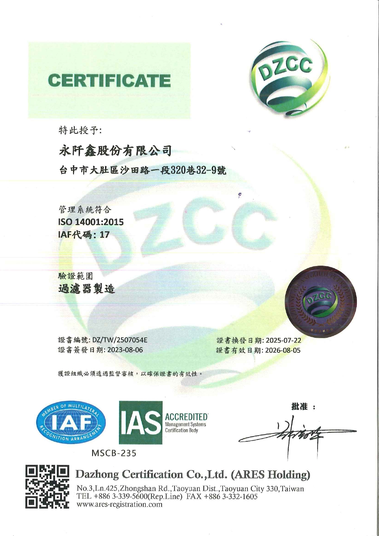 本公司已更新國際標準ISO9001:2015(品質管理系統)與ISO140001:2015(環境管理系統)的認證。